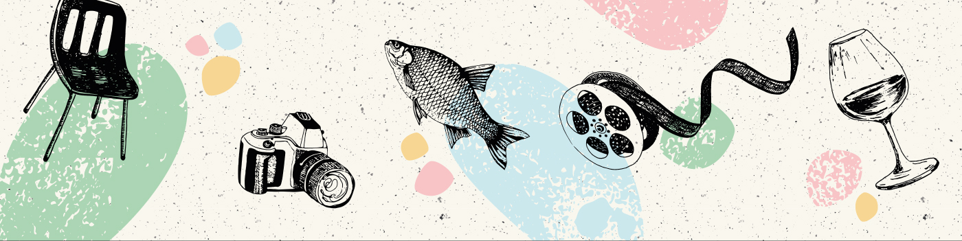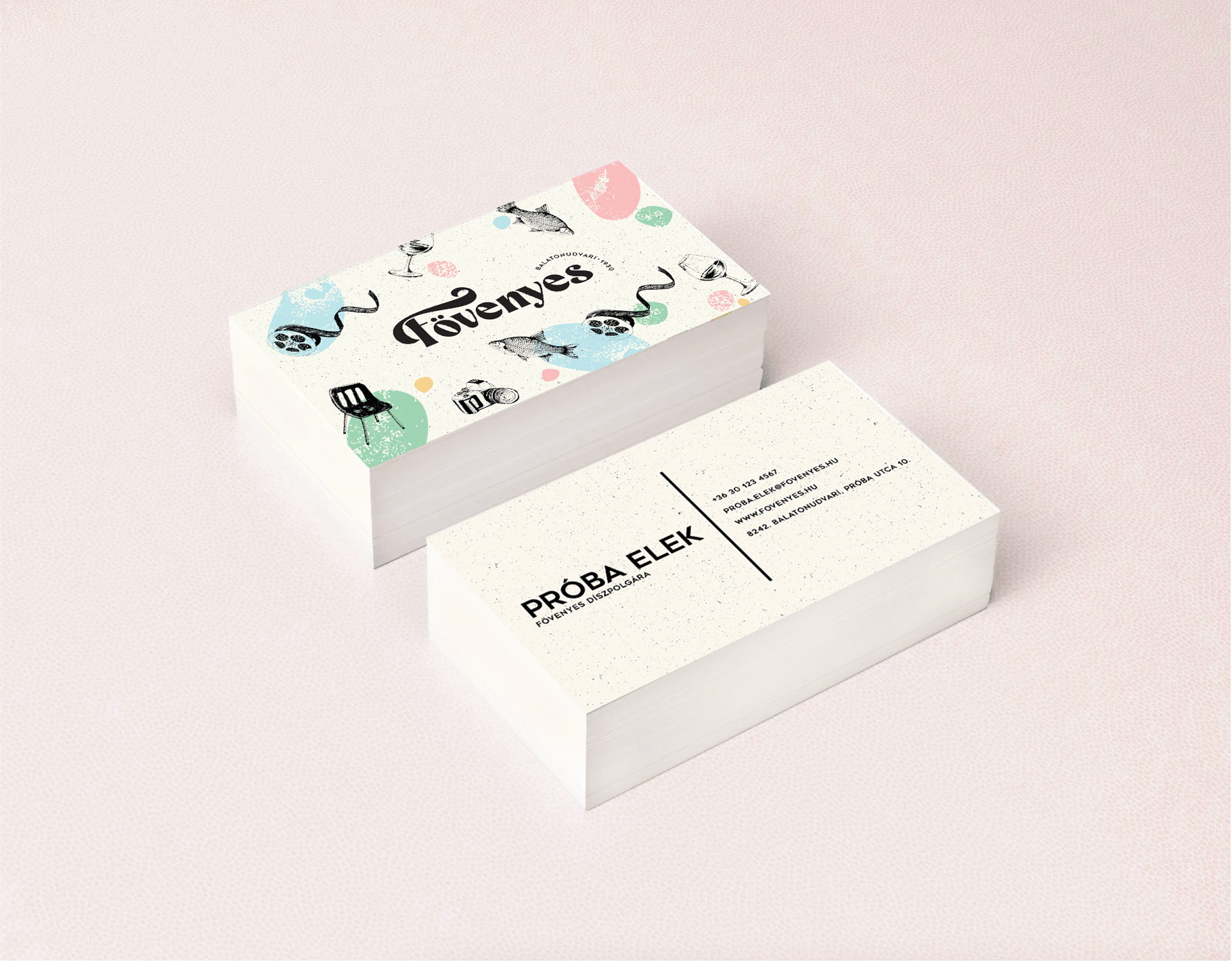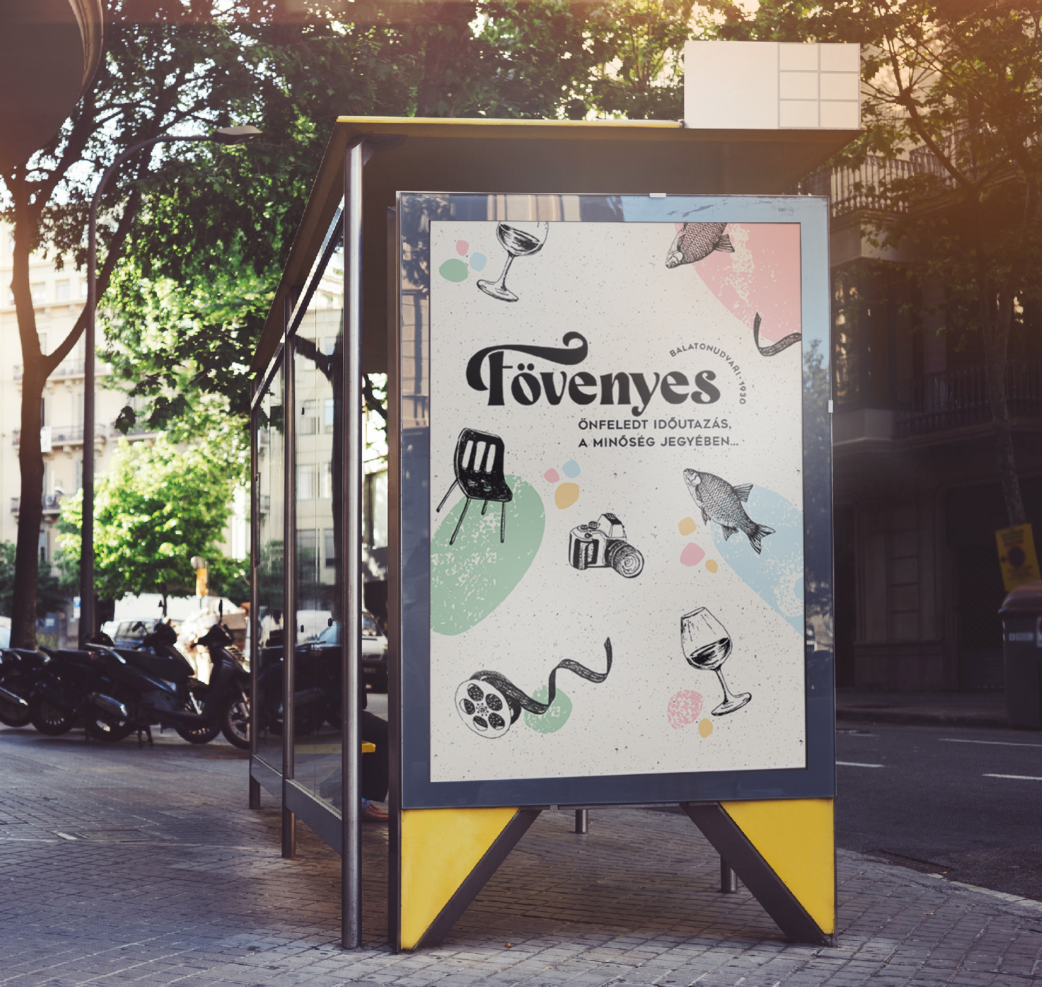 Illusztrációimban megtalálható Fényképező gép, mozi filmtekercs, műanyag székek, talpas poharak, és vízben úszkáló halak. A Balaton part, de kifejezetten Fövenyes kellékei a tökéletes napsütötte nappalok és a fülledt meleg nyári éjszakák eszköztárából. A kézzel alkotott részlet gazdag Pop Art stílust idéző illusztrációim, kellő humorral festik elénk a hely szellemiségét, összefonódva a vidám színű színes kerekded foltokkal, amelyek szintén a retró hangulatát sugallják.
